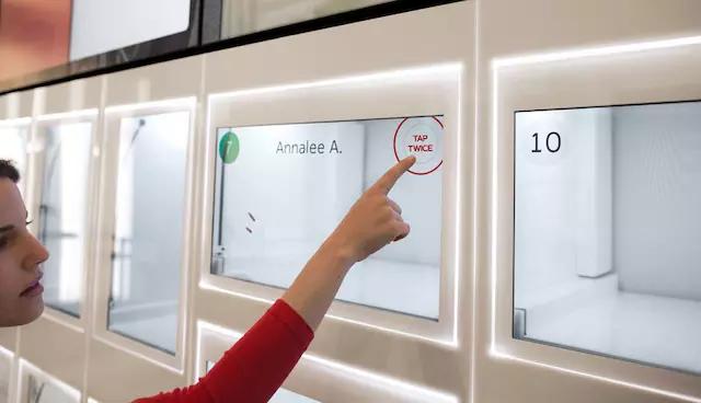 在你面前,是显示有你姓名、甚至所点餐食的营养数额、卡路里等信息的透明电子屏,轻触打开,取出食物,餐厅基本的全流程到此都完成了。