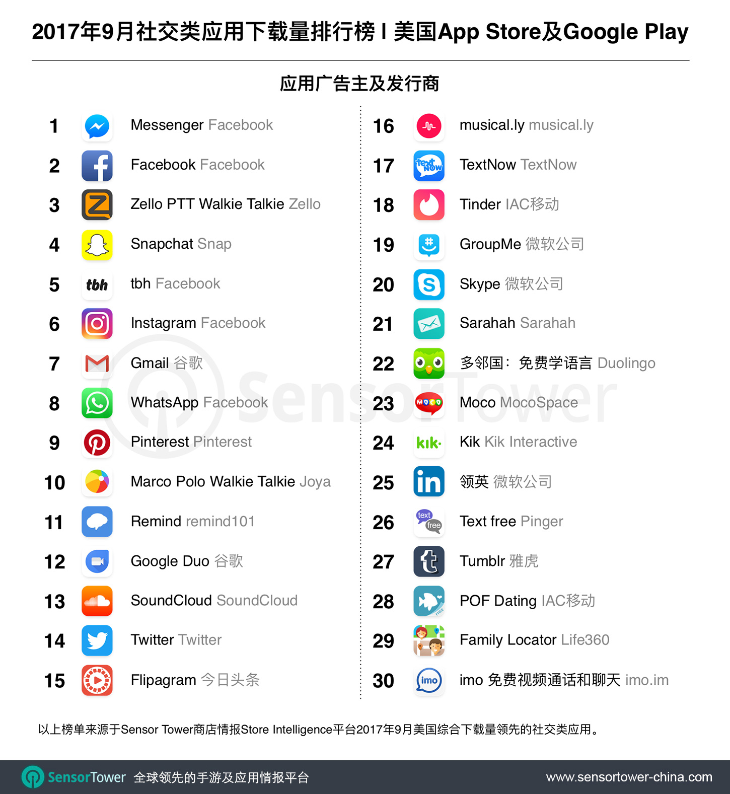 Sensor Tower商店情报Store Intelligence平台最新数据为您揭露今年9月份期间,美国移动市场上综合下载量最高的前30强社交类应用有哪些。我们的分析发现,前十强中有五款均为Facebook旗下的各类社交应用,新一类匿名社交应用如tbh及Sarahah迅速蹿红,而musical.ly是打入美国9月榜单的唯一一部中国开发应用。同时,比较上月中美两国受欢迎的社交应用,美国流行的多款对讲机和视频聊天应用,在中国已被包含在了微信里;而红遍全中国的直播应用在美国还并非主流社交工具。