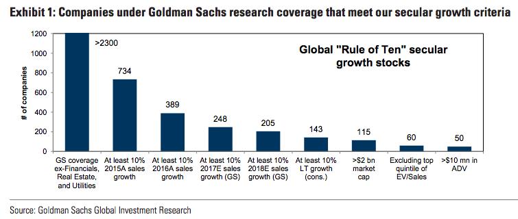 基于这种美国经济增长加速下滑、其他地区温和增长的背景,高盛从全球2300只个股中挑出了50只在这种环境下表现最佳的个股,其号称“十规则”(Rule of Ten)的筛选标准包括: