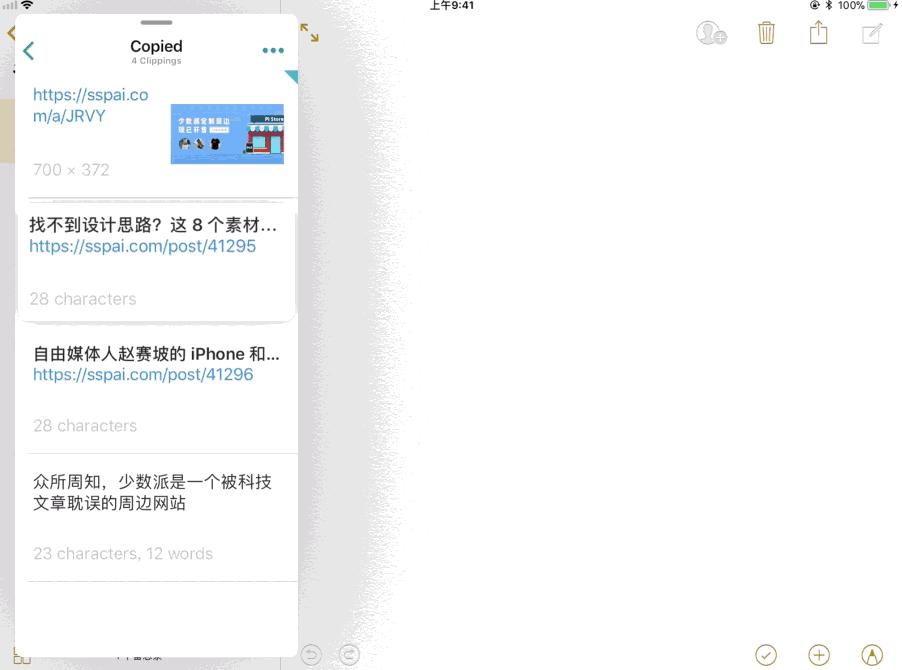 我在写剪贴板工具测评的时候,「囤积」了大量素材,久之发酵出了一个想法:剪贴板已经支持了多种文件格式,能不能把它们打造为零碎内容的管理中心?于是,我开始有目的地用 Copied 代替原生备忘录,发现在 iPad 上,拖动收集、调用内容比使用笔记应用要方便得多。