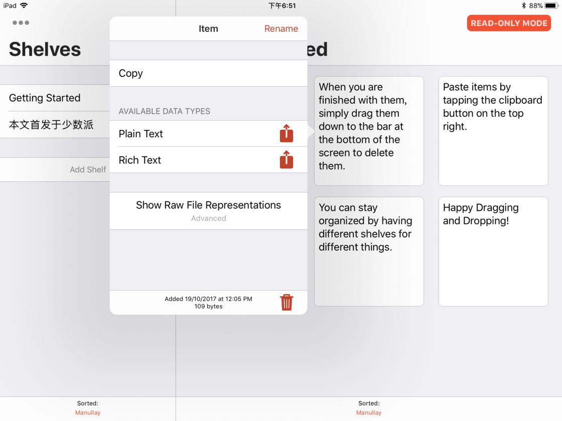 如果你是一个剪贴板重度用户,也许不需要单独的 Shelf App。但是 Copied 的一大问题就是支持格式有限,那么 iPaste 是另一个选择不错的选择。分组和 Pin 可以把常用内容拎出来,同步也是亮点,可以和 macOS 版的 iPaste 协同工作。