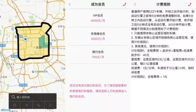 那时的 EZZY 在运营规则和计费体系方面比较复杂,同时给自己定的起点较高,或者说他们所锁定的用户群是较高的。VIP 会员月费 4000 元,可以不限次使用闲置车辆,而运营区域也有 ABC 三区,A 区包括 CBD、三里屯,B 区覆盖四环,C 区为除此之外的北京城区,在不同的区域用车或在不同的区域还车,都有一定的规则和费用差异。
