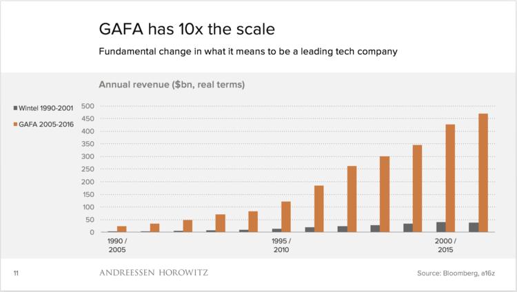 如果把时间线调整一下的话,这种变化甚至还要令人震惊。如果你把GAFA统治期内的情况跟Wintel统治期内的情况进行对比的话,你看到的就不是3倍规模的不同,而是10倍的不同。成为技术巨头的概念已经跟过去不一样了。