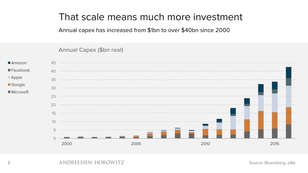 这种规模意味着投资多很多(年度资本性支出已从2000年的10亿美元增长至400亿美元)