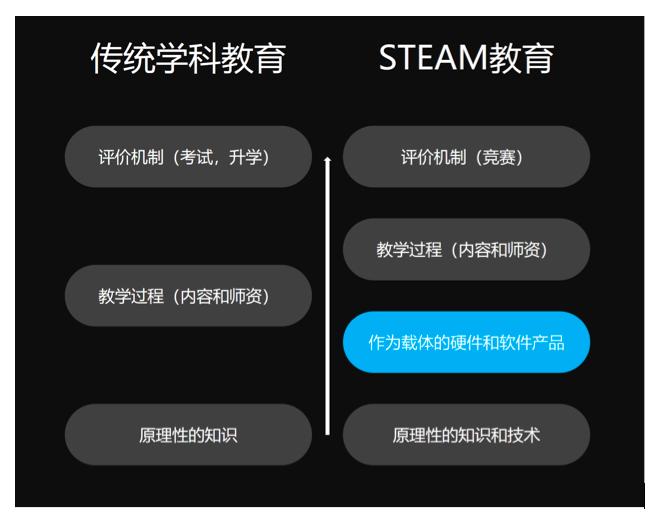 STEAM教育与传统学科教育相比,会多一个环节,作为载体的硬件和软件产品,传统学科教育教授原理性的知识几乎不需要什么产品做支撑,比如教授数学定律只要黑板和纸就可以了;但是在STEAM教育领域,在很多场景下需要各种硬件和软件的产品做支撑,比如教学生动手做机器人需要相应的硬件产品,教授编程相关的知识一定需要编程软件。STEAM教育的很多内容和师资也需要基于某种硬件和软件的产品。