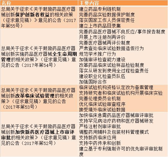 首先来看药物及医疗器械研发方面的政策,最先提及的是CFDA5月11日连发的四项关于鼓励药品医疗器械创新的相关政策。