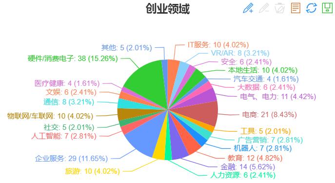 本次榜单 252 个创业项目覆盖超过 16 个领域,其中硬件/消费电子最多,占比为15%,另外创业项目分布较多的领域还包括企业服务、电商、金融、本地生活。