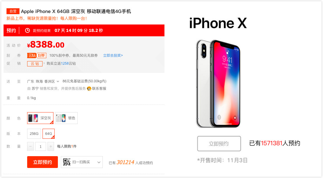 先说一下,京东、天猫和苏宁易购三大网络平台上有苹果授权的官方旗舰店。通过这些平台,用户可以买到正版的国行iPhone X。在这几大平台上,9月底的时候就已经可以预约。预约不需要付款,其实还是在排队。明天才是真正的预购。