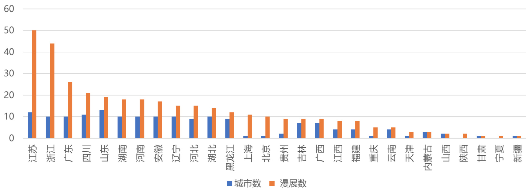 如上图数据所示,江苏、浙江总体的漫展数以超过40场的数量遥遥领先,形成了中国十一漫展活动举办数量最多的省份。此外,广东、四川、山东、湖南等12个省、直辖市,则凭借漫展数达到超过10场的成绩,形成了十一漫展热度排序的第二梯队。