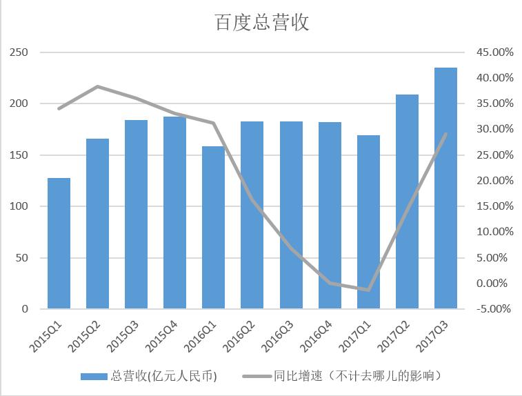 财报中,百度对下一季度业绩进行了展望:预计在2017年第四季度,百度的营收总额将会介于222.3亿元人民币(约合33.4亿美元)到234.1亿元人民币(约合35.2亿美元),同比增长22%到29%。移除百度游戏与百度外卖影响,同比增长28%至34%。该展望只代表基于当前情况的初步预测,不排除今后有调整的可能。