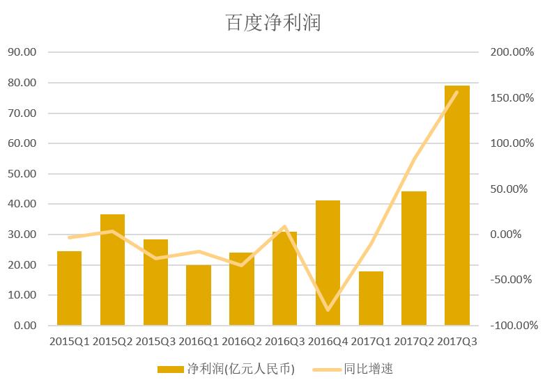 北京时间10月27日,百度(NASDAQ:BIDU)公布了2017年第三季度未经审计的财务报告。据财报,本季度百度营收为235亿人民币(约合35.3亿美元),同比增长29%;净利润79亿人民币(约合12亿美元),同比增长156%。非美国通用会计准则下,净利润91亿元人民币(约合13.6亿美元),同比增长163%;其中移动营收占比73%,高于去年同期的64%。