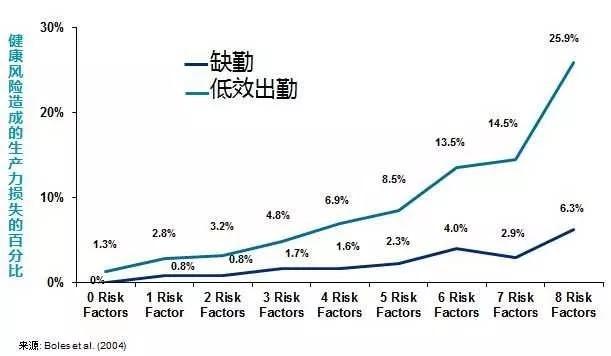 调研发现,如果一个员工健康风险达到8个全占时,即使他出现在公司上班,他的工作效率只有正常人的3/4。这在人力资源圈里,是个很恐怖的数据:企业吭哧吭哧做个历时1-2年的组织架构变革,各种辛苦各种得罪人,能提升20%的效率就喜大普奔了好不好啊,结果员工不够健康,一夜回到解放前……