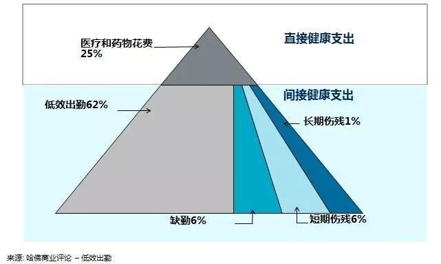 员工健康对企业的最大影响不是医疗成本的提升(嗯,欧美主流企业给员工提供团体健康保险和医疗服务)——只占25%,也不是因为员工生病导致的缺勤增加——占6%,而是低效出勤(Presenteeism)又叫带病工作,占到62%。