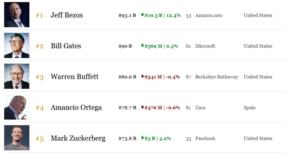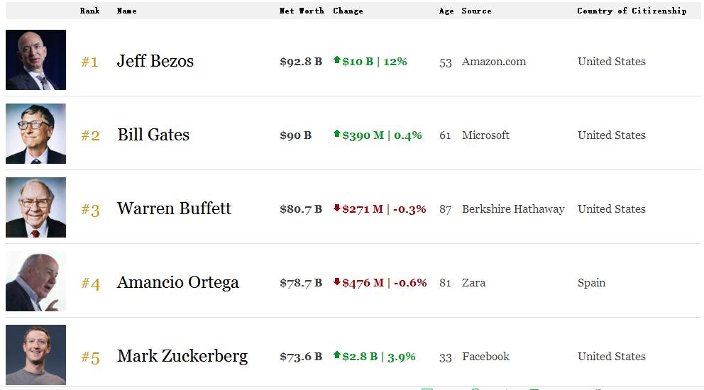 你一定很关心收盘时,贝索斯到底的财富到底有多少?根据福布斯富豪实时榜,贝索斯一夜之间财富暴涨103亿美元,达到931亿美元,比排在第二的比尔·盖茨多出了31亿美元。