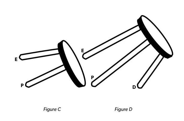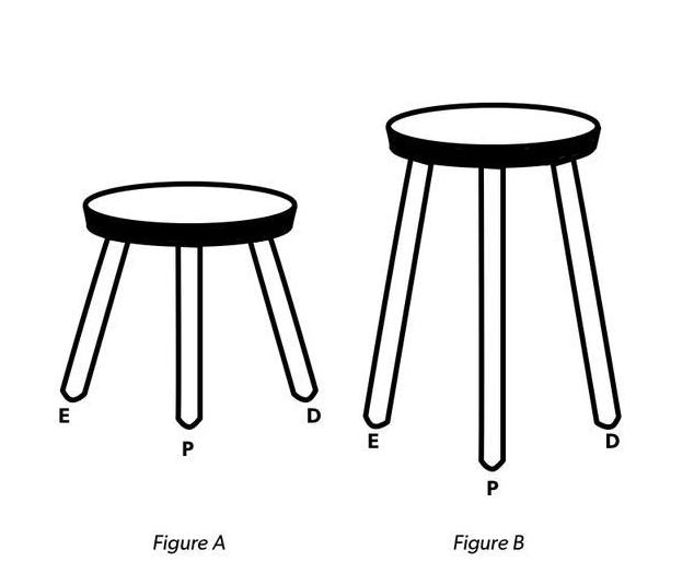 如果你不在一开始遵循这个原则,那么最后你只能做出一个蹩脚的产品,就会像下面的凳子那样不稳固。如果产品开发之初一个设计师都没有,那么你的产品就会像下面Figure C图里的凳子一样,少一条腿。如果你在产品已经开发到一定阶段且比较成熟之后再让设计师参与,那么你做出的产品可能就会像Figure D图中的凳子那样,三条腿不一样长。