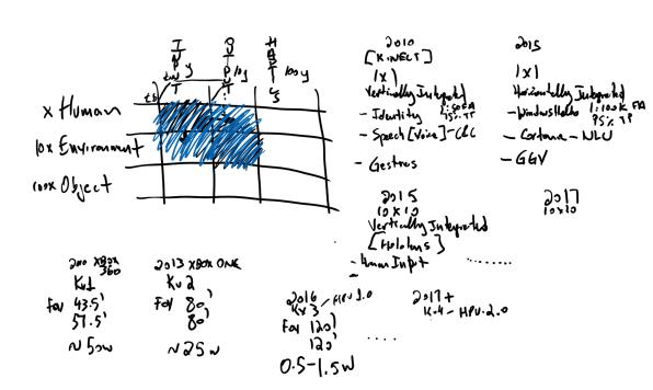 我与Alex Kipman在Skype上聊天,他拿出一些白板,介绍自己过去10年的生活,2007年开发Kinect,近年又开发了HoloLens。