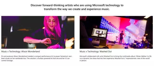 Music X Tech是微软官网下的一个子网站(https://www.microsoft.com/inculture/musicxtech/),从上线起就被微软官方称做是一个“音乐和科技跨界结合”站点,主要关注的是一些艺人近期的活动如何与科技相结合的案例——当然了,这里特指微软自家的科技。
