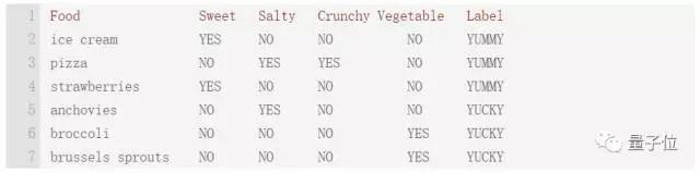 现在,我们需要一些特征。不妨就将这些样例设置为甜、咸和蔬菜三个特征,因为为二元特性,所以每种食物的每个特征都被赋予“是”或“否”的值。