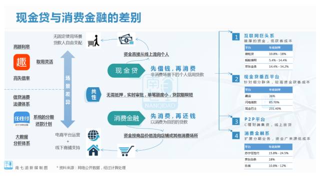 从目前发展的情况来看,消费贷的整体风险要低于现金贷,但是利率相对较低,行业竞争比较激烈;而现金贷由于利率较高,流程较短,能快速开展业务,且在做好风控的同时,用高利润覆盖高风险。