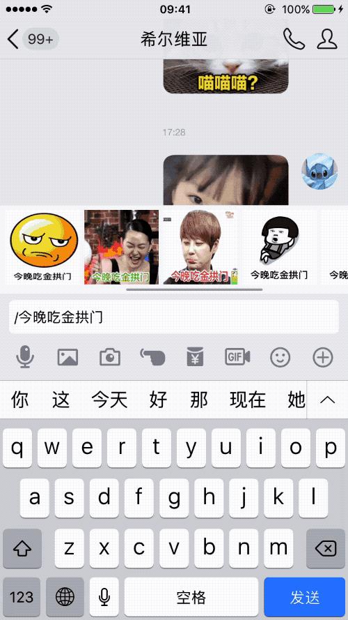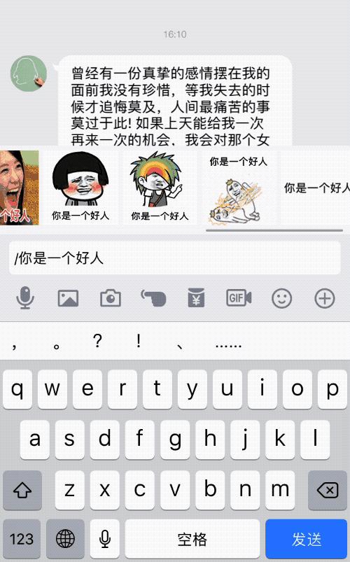 接着,在斜杠「/」后面输入你想说的话或者关键词,马上就能在对话框上方出现 8-10 个备选的动态表情包,每个表情包上都会有你所输入的文字内容。