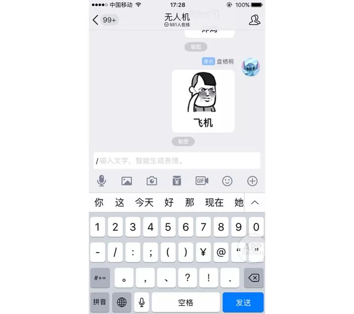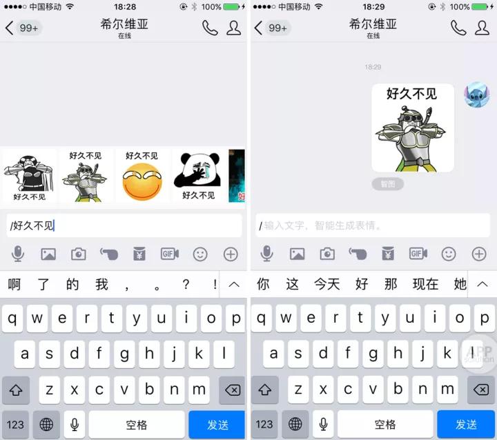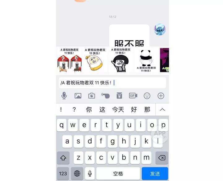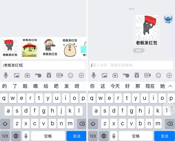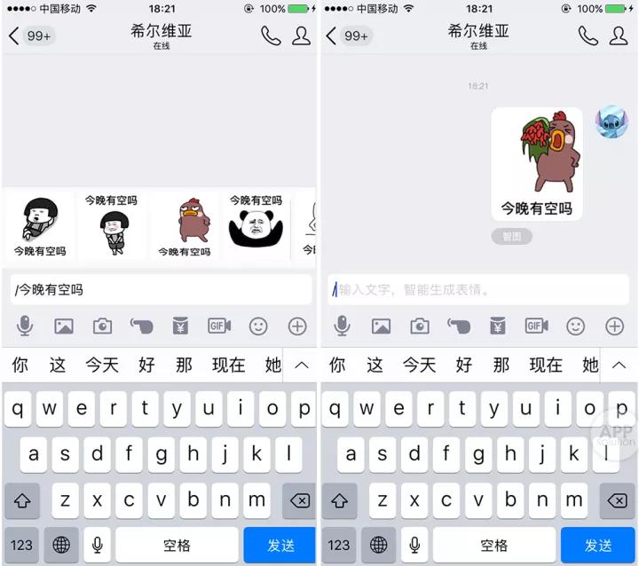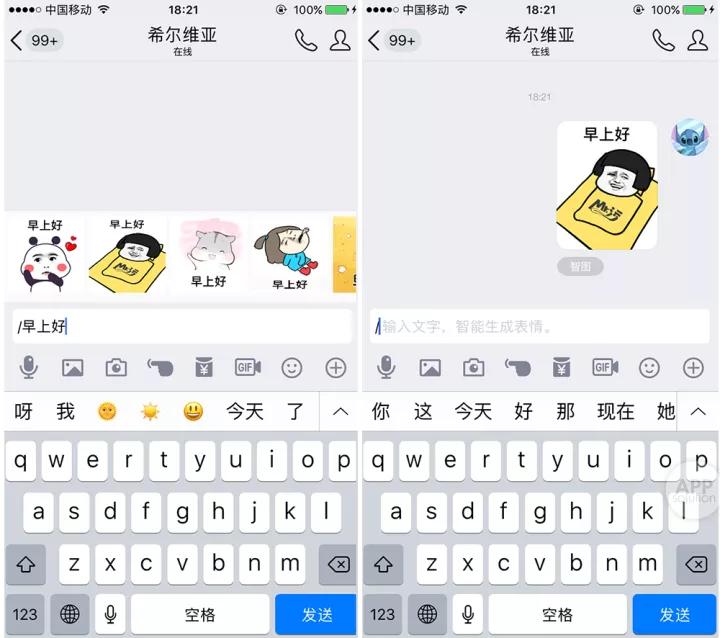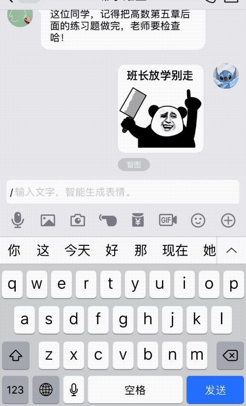 由于「智图」功能生成的表情包上,会出现所输入的文字,因此,我们只要在斜杠后面输入的语句中,加上对方的名字,就可以用来发送带有特定祝福的表情包。