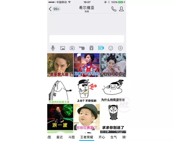 手机 QQ V6.7.0 版本后,聊天窗口新增了 GIF 入口。我们点击功能栏 的「GIF」标识,就能进入 GIF 热门图库,王者荣耀、热图、卖萌、搞怪、发红包等各种 GIF 表情应有尽有,可以一键取用。