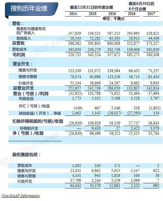 在财务数据上,搜狗招股说明书显示,该公司截至2017年6月30日的上半年总营收为3.73亿美元,高于上年同期的3.23亿美元。其中,搜索和搜索相关广告营收为3.29亿美元,高于上年的2.94亿美元;其它营收为4440万美元,高于上年同期的2890万美元。