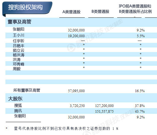 搜狗招股说明书显示,在首次公开招股之前,搜狗高管和董事合计持有公司5709.5万股A级普通股,占公司总股本的16.5%。其中,张朝阳持有3200万股A级普通股,占总股本的9.2%;搜狗首席执行官王小川持有1920万股A级普通股,占总股本的5.5%。