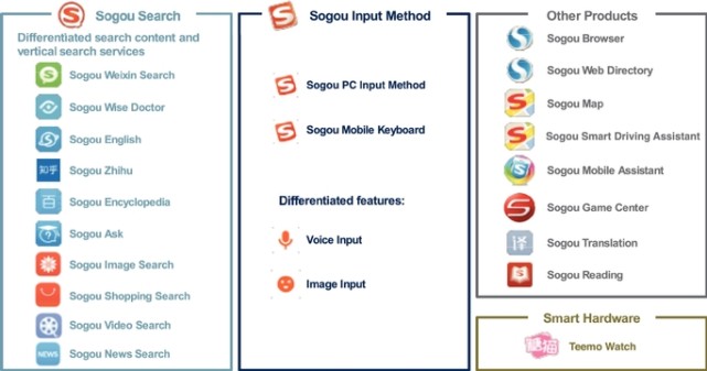 搜狗业务由四大部分组成:搜狗搜索、搜狗输入法、智能硬件以及其他产品。搜狗搜索包括微信搜索、明医搜索、知乎搜索等10个产品,搜狗输入法包括PC输入法、移动端输入法、语音输入法及图像输入法4个产品。其他产品主要为搜狗浏览器、搜狗地图等;智能硬件主要为糖猫系列产品。