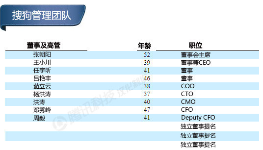 招股说明书显示,搜狗董事会由董事会主席张朝阳、搜狗CEO王小川、腾讯COO任宇昕和搜狐前CFO吕艳丰组成;搜狗的高管层还包括2016年6月16日集体晋升的COO茹立云、CTO杨洪涛晋升、CMO洪涛,以及CFO邓秀峰和DCFO(Deputy Chief Financial Officer)周毅。另外空缺三个独立董事席位。