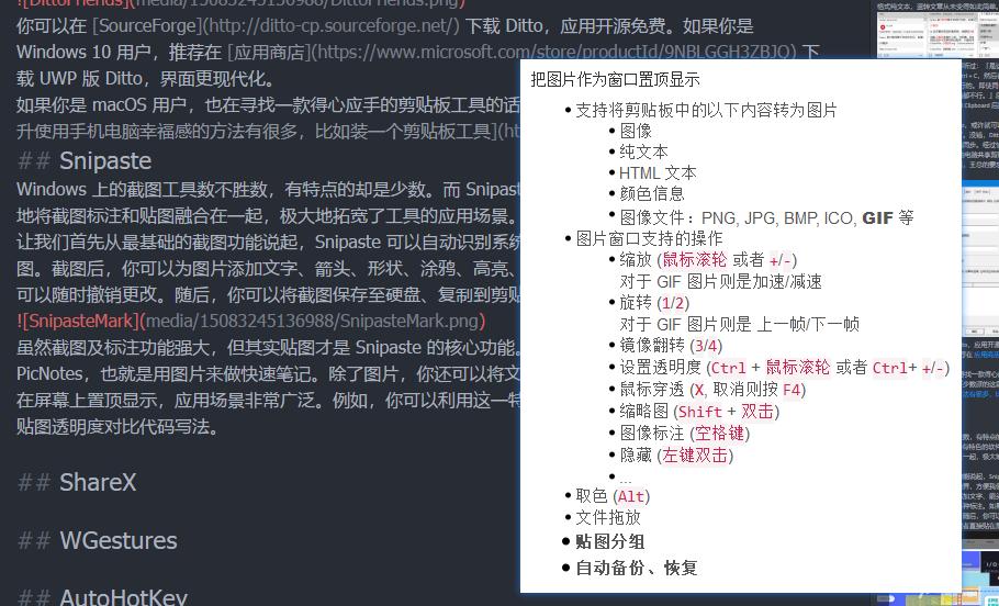 虽然截图及标注功能强大,但其实贴图才是 Snipaste 的核心功能。实际上,Snipaste 的原名就是 PicNotes,也就是用图片来做快速笔记。除了图片,你还可以将文字、HTML 文本、颜色信息等作为窗口在屏幕上置顶显示,应用场景非常广泛。例如,你可以利用这一特性方便地做笔记时参考资料,或者调整贴图透明度对比代码写法。