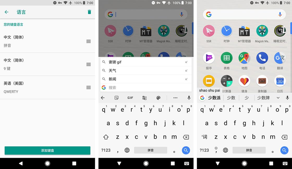 只需进入设置添加中文键盘,即可开启 GBoard 的中文输入功能。尽管只支持全键盘、九键两种键盘模式且不支持双拼,但依然让不少 Google 拼音用户口耳相传、激动不已。