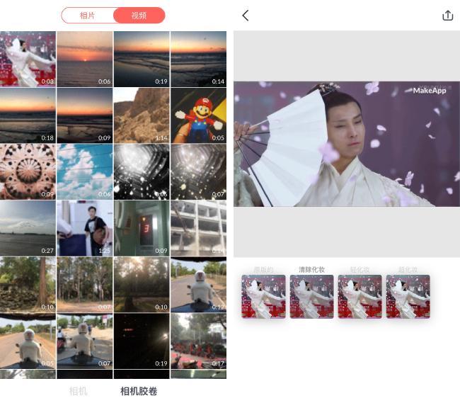 相比照片处理中风情万种的各类妆容,视频要简陋得多,仅提供了卸妆、淡妆和浓妆三种模式。需要注意的是,由于视频需要逐帧处理,若视频较长,可能会耗费大量时间和电量,而且有闪退的情况出现,处理之前记得关注一下时长哟。