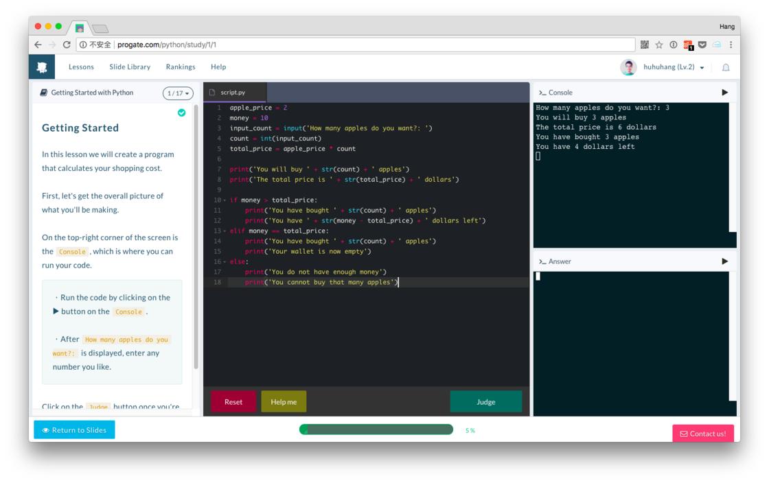 Progate 不仅仅有图文教程,还同时提供了一个在线的编程调试环境。当你在学习 Python 时,可以根据教程一步一步完成由易到难的编程挑战和测验。