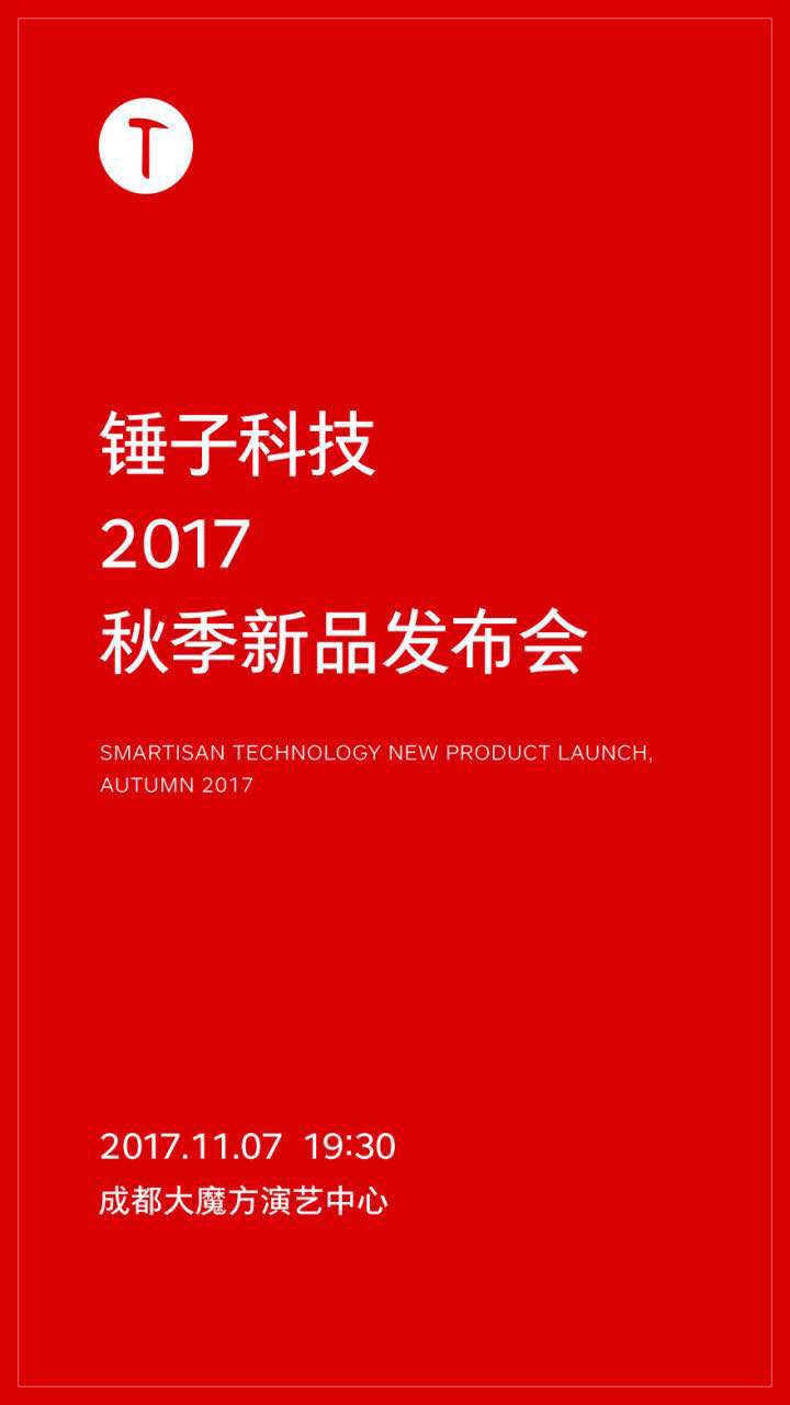 10月30日晚间消息,锤子科技今日确定2017年秋季新品发布会时间,将于11月7日在成都举行根据锤子科技公布的宣传海报上的信息显示,新品发布会将于11月7日19:30在成都大魔方演艺中心举行。
