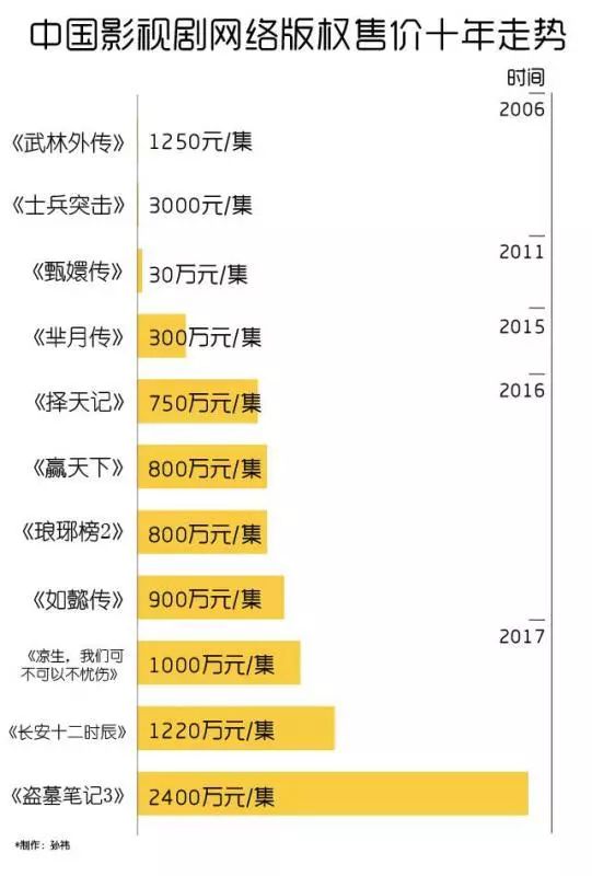 早在2006年,一部席卷中国各大卫星频道的《武林外传》,网络版权价格仅为1250元/集,整部剧约10万元。同年,掀起一阵收视狂潮的《士兵突击》同样只有3000元/集,整部剧9万元。