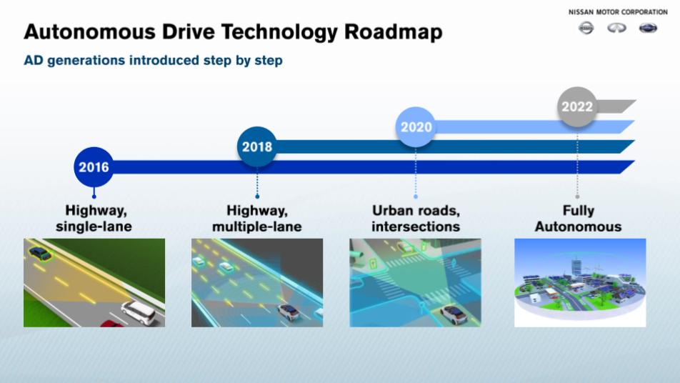36氪了解到,日产的自动驾驶研发路线分为四步走,分别是2016年高速公路单车道自动驾驶(已在新Leaf上落地);2018年高速公路多车道自动驾驶;2020年城市道路自动驾驶和2022年实现全自动驾驶。