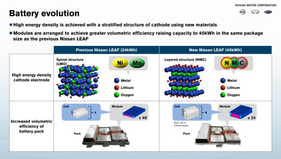 2010款Leaf配备的镍锰酸锂电池在新Leaf里换成了三元锂电池组,容量也从24kWh增长至40kWh;据日产工作人员介绍,层叠式锂离子电池单元在结构上得以改进,与2010款相比,能量密度提升了67%。对锂离子电池的另一个关键工艺的优化,体现在加强版的电极材料上。电极材料采用经改良的化学成份制造,从而提升电池能量密度,也使得电池拥有更高的耐久性。新Leaf的电池在不增加体积的前提下提升了蓄电性能。在日本标准JC08燃油模式测试下,新Leaf单次充电后续航里程可以达到400公里。