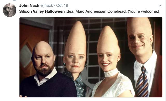 来扮硅谷著名投资人、网景创始人 Marc Andreessen 吧!毕竟,Marc Andreessen 在硅谷是个家喻户晓的名字,他以两件事为人所知:1. 会投资;2. 头很秃。