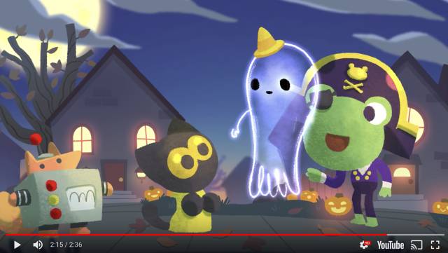 Jinx 不想成为一个可怕的鬼魂,它只想成为一个友善的鬼魂,与其他 Google 小动物捣蛋玩耍。所以 Jinx 在万圣节夜晚做了不同的装扮来掩饰它的幽灵身份,试图和大家看起来一样:它首先扮成女巫,然后是木乃伊、公主、大黄蜂、智能手机、烤面包片、圆筒冰淇淋……最后,它决定把一块白布批在身上“扮”鬼。
