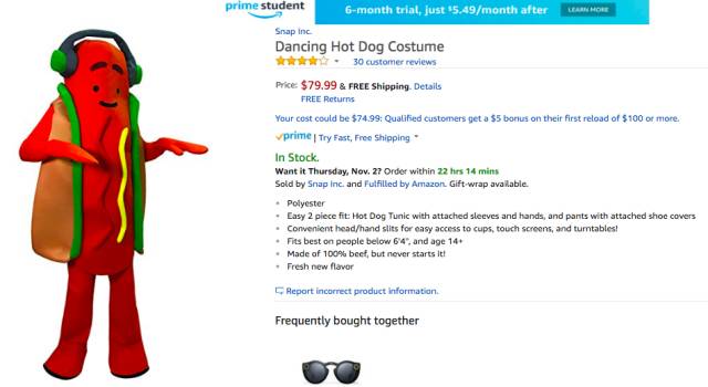 卖完眼镜的 Snap 公司今年竟然在 Amazon 上卖起了热狗服!唔,还真不便宜,不含税都得快 80 美金呢。不过,可是有很多的五星好评呢!