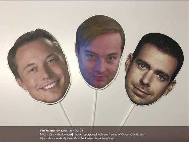 来,给你几个硅谷大佬的面具——左边是“钢铁侠” 埃隆•马斯克,中间是投资了不少估值十亿美金以上的“独角兽” 公司的 Jason Calacanis;右边是Twitter 的 CEO Jack Dorsey 。
