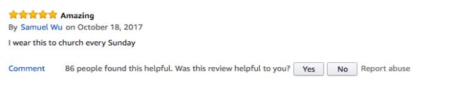 有客户评论说:我每个周日都穿着它去教堂。(这位大哥,这样真的好吗?)