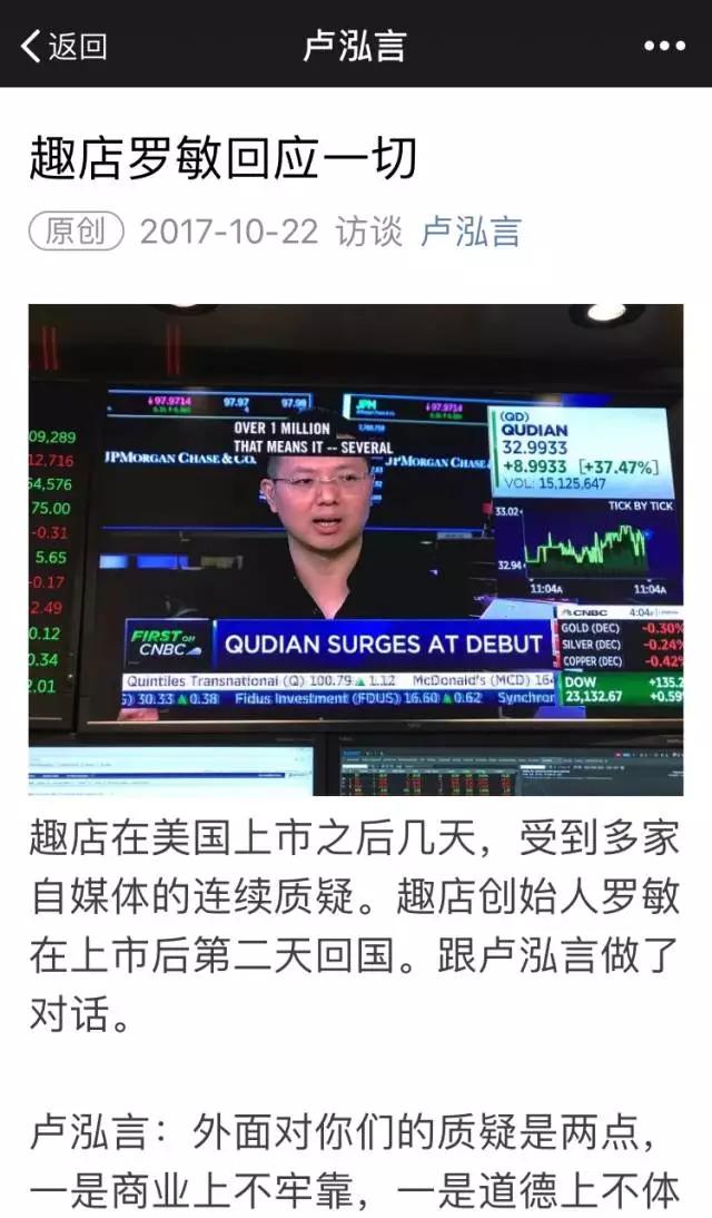 纽约时间2017年10月18日,趣店集团成功在纽约证券交易所挂牌,股票代码“QD”,发行价24美元,共发行3750万股,开盘价为34.35美元,市值一度高达113.31亿美元。成为继宜人贷、信而富后第三家在美国上市的互联网金融企业,更成为美国今年IPO规模最大的中资企业。然而,早在趣店集团向美国证券交易委员会递交首次公开上市申请招股说明书时,趣店的暴利增长和“现金贷”就受到投资人的关注和媒体的质疑,负面舆论不断。