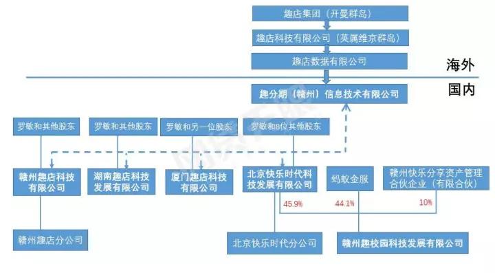 根据趣店集团招股说明书披露的股权结构图,趣店集团注册于开曼群岛,在英属维京群岛设立子公司趣店科技有限公司后,在香港设立了孙公司趣店数据有限公司。趣店集团的境内实体企业为注册在赣州经开区的趣分期(赣州)信息技术有限公司(以下简称“赣州趣分期”),赣州趣分期通过协议控制趣店集团的境内运营实体北京快乐时代科技发展有限公司(以下简称“北京科技”)及其子公司。