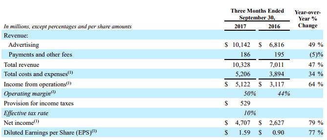 在第三季度,广告营收为101.42亿美元,比去年同期的68亿美元增长49%。从收入占比来看,广告占总营收的比例为98.20%。2017年Q2这一比例为98.32%;2017Q1为97.82%;2016Q4为97.96%。