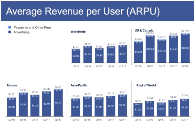 从过去两年的数据来看,Facebook的DAU增速已经渐趋稳定,增速也没有那么快了。具体按地区来看,欧洲和美国&加拿大地区的增速明显下降,而亚太区和全球其他地区的增速明显加快。从用户数量来看,也主要来自后两大区。