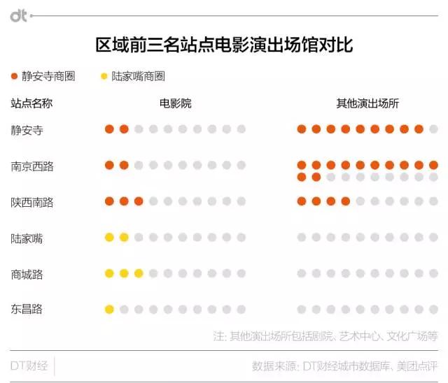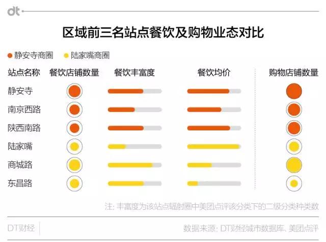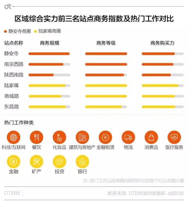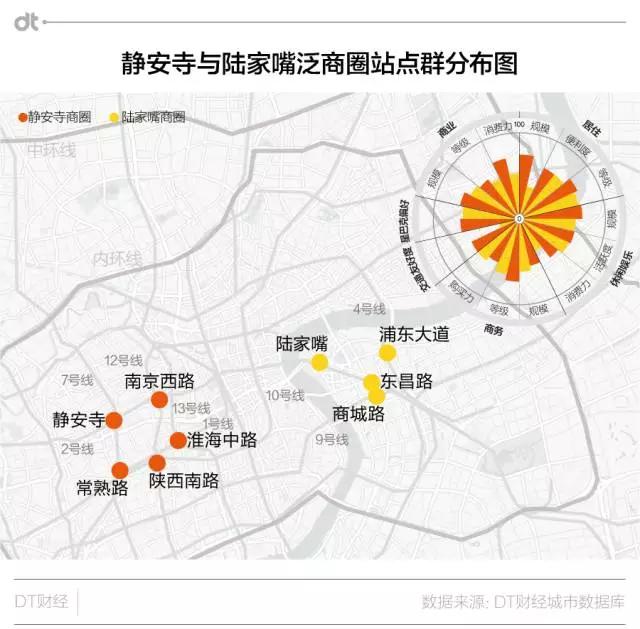在DT君11月底即将在上海发布的《2017上海城市大数据活跃报告》中,我们使用多源数据建立了“地铁1公里”辐射圈指标体系(BLECTS),静安寺地铁辐射圈的综合实力排到了第一名,陆家嘴则排名14,不过单独看商务实力,它们又相差无几。