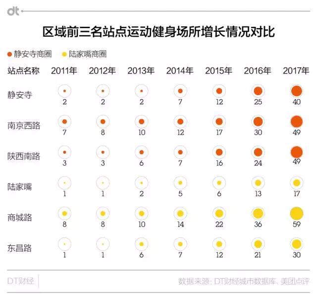 不过说到最近两年热起来的健身举铁运动,陆家嘴还算能在内部消化周边上班族的需求。在两个泛商圈站点群中,商城路的运动健身场所近年增速最高,且总量达到59家,露露经常去的健身房也在附近。东昌路距离商城路较近,有一定的站点辐射作用,健身场所也达到了30个。而陆家嘴站点周边的健身房数量却一直增长缓慢。