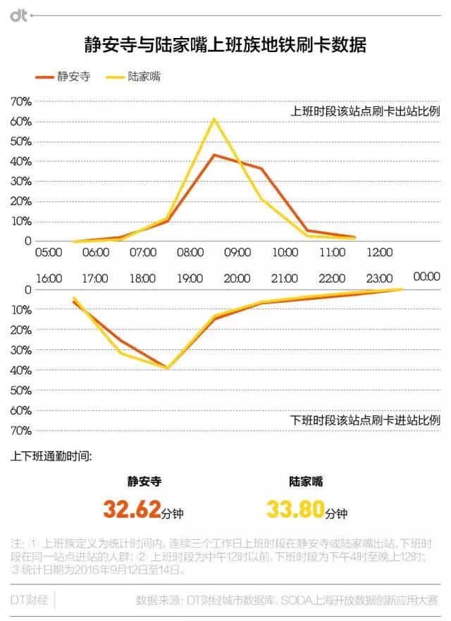 陆家嘴在上午8点到9点迎来上班族刷卡出站高峰,比同时段的静安寺高出18%,而静安寺从8点到10点都有大量上班族出站。